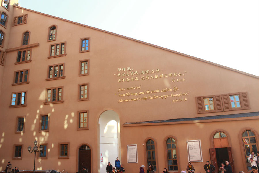 教堂对面写着约翰福音14章6节的经文(图:福音时报)