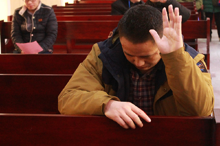典礼开始前,教堂二层一弟兄正在祷告(图:福音时报)