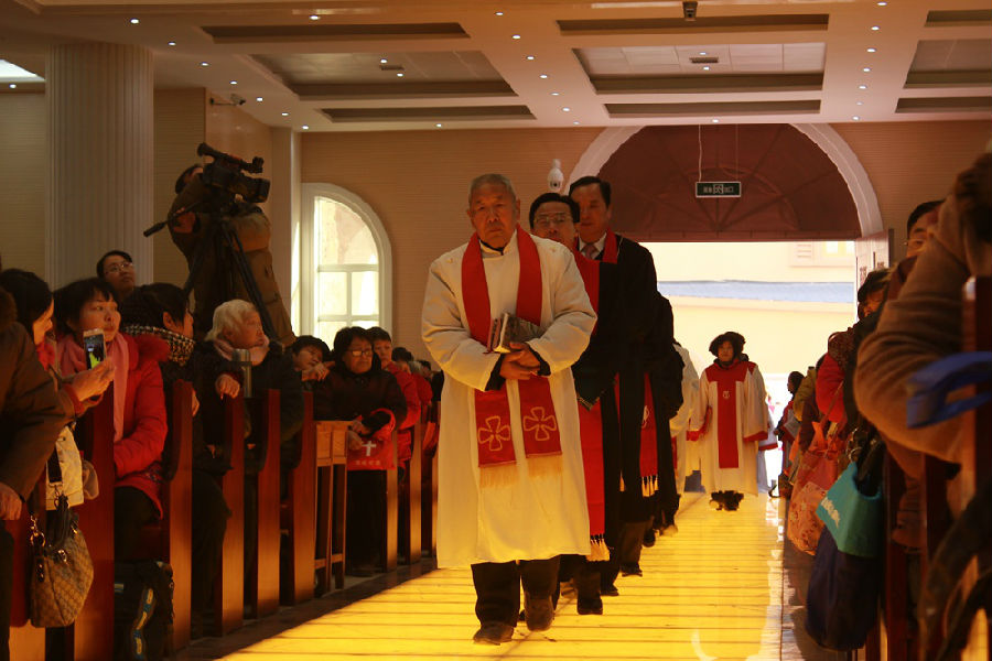 众牧者和诗班沿着金色的通道缓缓走入圣殿(图:福音时报)