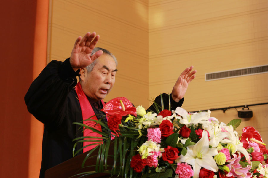 河南省基督教协会副会长、三自爱国运动委员会副主席张富华牧师读《圣经·彼得前书》2章5节(图:福音时报)