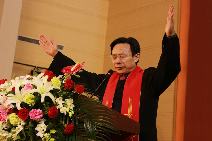 郑州市基督教两会副主席、副会长黄兴牧师为长江路教堂感恩、为太康路教堂兴建祈求(图:福音时报)
