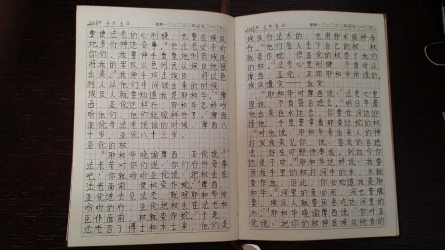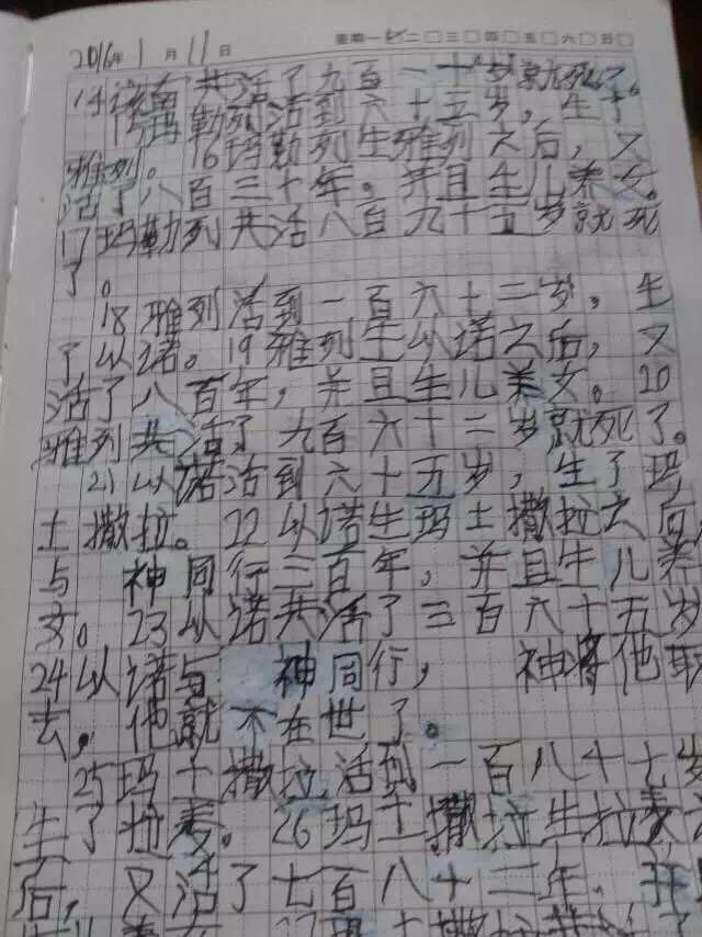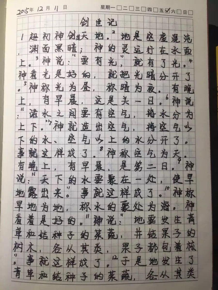 “开始一项简单的事情!”2015年12月11日,大连的李银明弟兄在微信朋友圈发了一个手抄圣经的信息,自此没有间断过,他计划用三年时间抄完一遍圣经。他还建立了一个抄写圣经的微信群,现在至少有60多人在坚持手抄圣经。