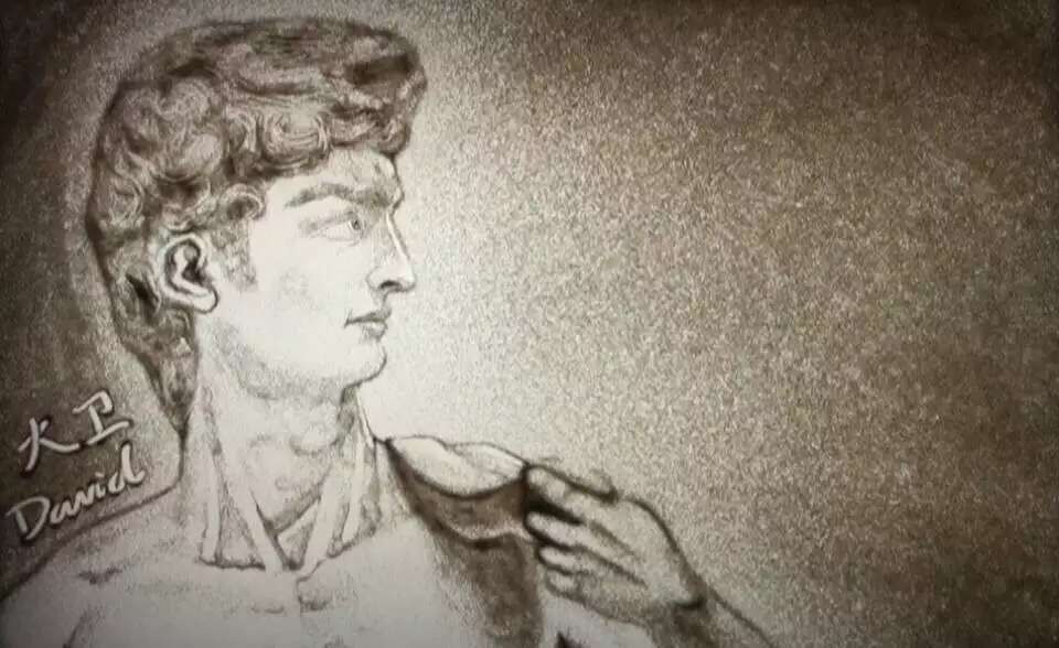 据刘圣彩老师介绍,沙画封面是他根据米开朗基罗的雕塑作品用了一上午时间制作的大卫头像,结尾采用的是大卫王弹竖琴的铜像,中间以卡通人物形式展现。