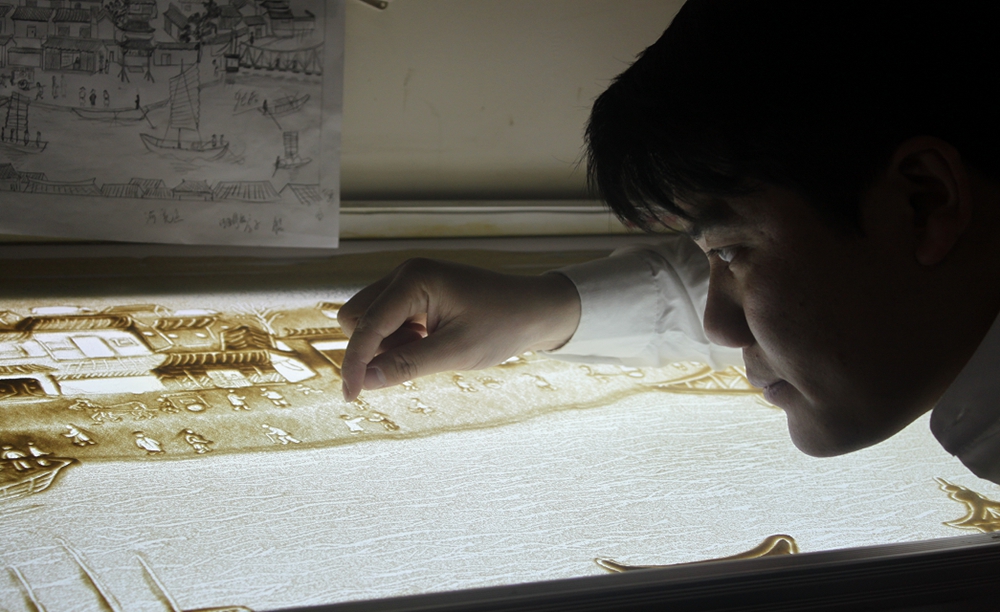刘圣彩介绍,整个沙画的创作历时3周,大部分的时间用在前期的构思与准备,正式录制只用了2天时间。