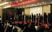 舞台的前方打着活动主题“以便以谢 ‘有一份爱为你在等待’”的横幅,舞台的旁边贴着红色的十字架,会场的墙上还用气球摆成一个十字架。
