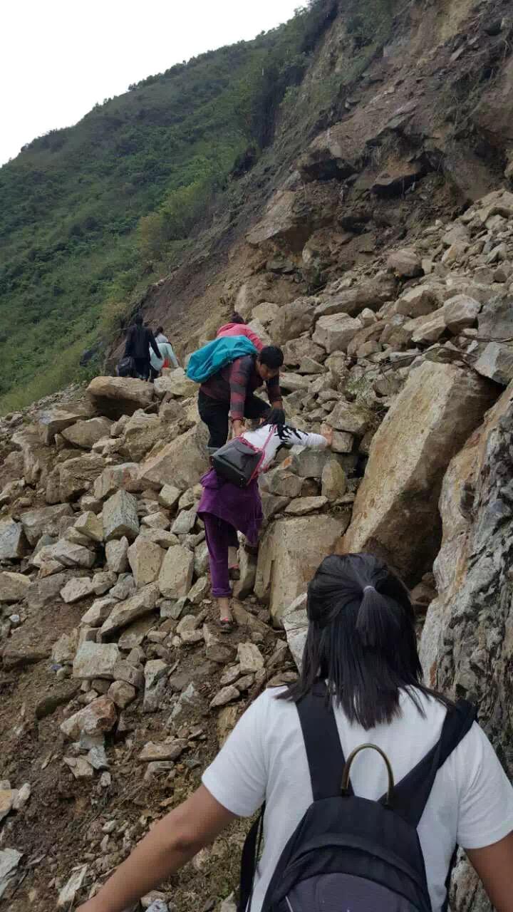 尽管如此,福贡县基督教培训中心还是照原计划开展了主日学老师培训,4月25日,迪传道在朋友圈分享了去接主日学老师的照片,可看到当地山体滑坡严重,教牧同工们互相搀扶着走过铺满碎石的山路。他还附上了一段文字:此次福贡强降雨两个多月,大部分车路被毁,昨天为了接主日学老师,徒步走了八个小时,而且都是在随时都塌方危险或再次泥石流的地方攀岩行走,虽一路惊险但主恩满滿……
