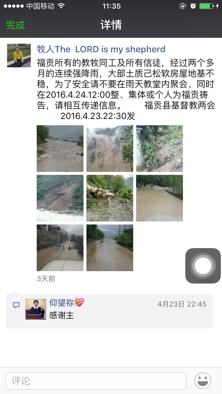 4月23日,福贡县基督教两会发布了信息,呼吁全县信徒和教牧同工为福贡祷告。通告信息为:“福贡所有的教牧同工及所有信徒,经过两个多月的连续强降雨,大部土质己松软房屋地基不稳,为了安全请不要在雨天教堂内聚会、同时在2016.4.24.12:00整、集体或个人为福贡祷告,请相互传递信息。福贡县基督教两会2016.4.23.22:30发。”