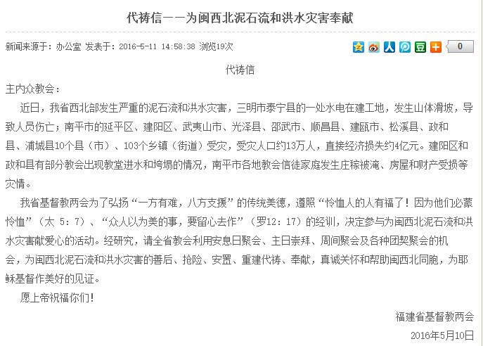 5月11日,福建省基督教两会发布了致主内众教会的《代祷信》,首先提到了近日来福建省西北部发生的泥石流和洪水灾害。“受灾人口约13万人,直接经济损失约4亿元。”代祷信中写道。省基督教两会表示决定参与为遭受此次灾害的人群奉献爱心的活动,并呼吁全省各教会利用主日聚会、周间聚会及各种团契聚会的机会,真诚关怀和帮助闽西北同胞。