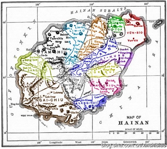 地图中海南岛(琼州府)共有13州县,King-toa,现位于海口市琼山区附近; Vun-sio,今日的海南省文昌市附近; Ui-hong、Lok-hui,位于琼海市附近; Vang-chiu,位于今天的万宁市附近; Leng-tui,位于今天的陵水黎族自治县; Ngai-chiu、Kam-un,两处都位于乐东黎族自治县,前者在涯州区附近; Sang-hoe,位于昌江黎族自治县附近; Tam-chiu,位于今日的海南省儋州市附近; Lim-ko、Dio-vai、Deng-an分别是临安县、澄迈县和定安县附近。