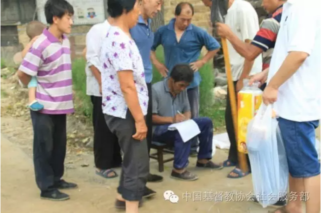 7月25日下午,邢台市基督教两会援助队结束第一批救援物资的发放,援助主要面对开发区四个重灾村---大贤村、景家屯、东市村、河会村。之后开始筹资购买第二批救援物资,部分物资于27日下午已经到位。28日早上六点,由王烨牧师带队的邢台市基督教同工集合,七点左右,救援物资车队出发。救援物资于上午十一点多到达邢台县白岸镇白岸村。村民们安静等候,按着各大队排队,领到物资后登记名册。村干部记录已经领到救援物资的人名单,确定每个人都能公平领到。