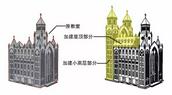 加建部分为六、七层上部的坡屋顶和教堂后部的10层。扩建的主要功能用房为办公空间。扩建屋顶部分采用坡屋顶形式,这样不仅使建筑立面更具有层次感,而且也方便屋面排水。扩建部分充分利用了原建筑的竖向交通,更大限度地提高了空间的使用率。