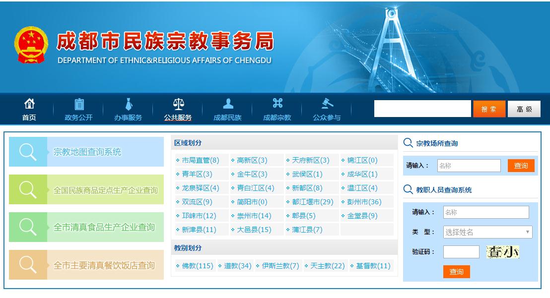 打开成都市民族宗教事务局官方网站,公共服务位于标签栏的第四个,标签栏还包括成都民族、成都宗教等。在公共服务中涵盖宗教地图查询、宗教场所查询、教职人员查询等六大板块。