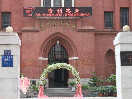 武汉市三镇汉口老城区中心繁华的江汉路旁边,矗立着这座哥特式教堂。红砖清水墙面条纹清晰,二个3米高的白色花岗岩石柱在大门左右相对而立,通透式的护栏,红白相间的院落地砖把教堂点缀得文雅大方,淋漓尽致。正立面高耸着23米的钟楼,还有右墙奠基石刻雕的“基创鸿磐、其址永固”,至今都保存完好。在左墙面镶嵌的青色石碑上,写着“武汉市优秀历史建筑”几个字。