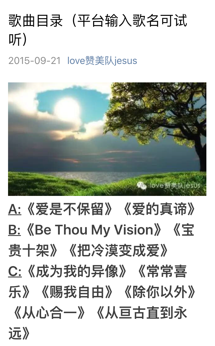 该平台提供的歌曲列表中包含80多首赞美诗,按照歌曲的首字母从A到Z排列。可供点播的赞美诗有《爱是不保留》《宝贵十架》《常常喜乐》《恩友歌》《将天敞开》《Open the eyes of my heart,Lord》等。