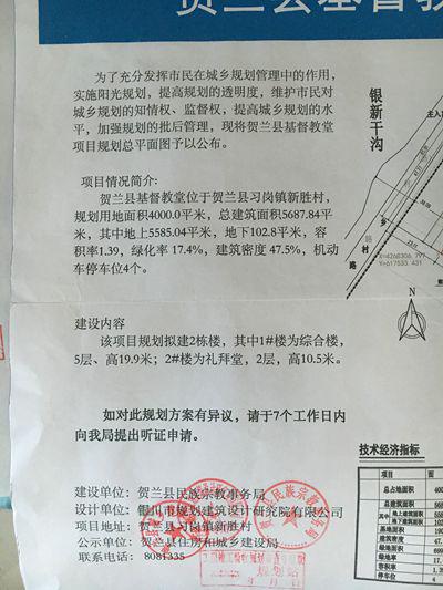 只有经历过的弟兄姐妹才能体会当时的心情,教会更加认识到贺兰需要有一个安全、安静、宽敞明亮的基督教活动场所。经过弟兄姊妹的不断努力、长夜祷告、祈求、争取,建堂一事终于得到政府领导的重视。2013年2月8日,贺兰县委办公室下发16号文件,2014年6月26日,贺兰县人民政府土地管理小组会议纪要,划拨给贺兰教会6亩土地建造教堂。2016年5月,各种手续基本办妥,这是一件多么值得感恩、荣耀归主的事情。然而,我们却无法喜乐,土地有了,教会本打算量力而行,建一座能满足聚会崇拜的教堂就可以,不讲样式。可是,情况却不是我们想的那样容易,这里不是农村,建筑要按城市规划,否则无法通过有关部门批准。消防通道、消防水池、楼梯、电梯、供热、供水、建筑高度、材质、绿地、卫生间都要按规定建造。设计概算大约需1500万元,且限期建成,否则土地收回。