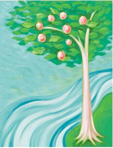 一个人是否有福怎样看得出来呢?蒙福之人的情况又是如何呢?中国人向来有向往“五福”的美好祝愿,所谓“五福”,按《书经•洪范》的标准就是:“一曰寿、二曰富、三曰康宁、四曰攸好德、五曰考终命。” 但为了忌讳,东汉的桓谭在其《新论•辨惑第十三》中便将“考终命”改成“子孙众多”来代替。那么,诗人告诉我们有福的人又是怎样呢?他先说有福的人要像一棵栽在溪水旁的果树(如图)。下面让我们藉此来继续思考和欣赏。