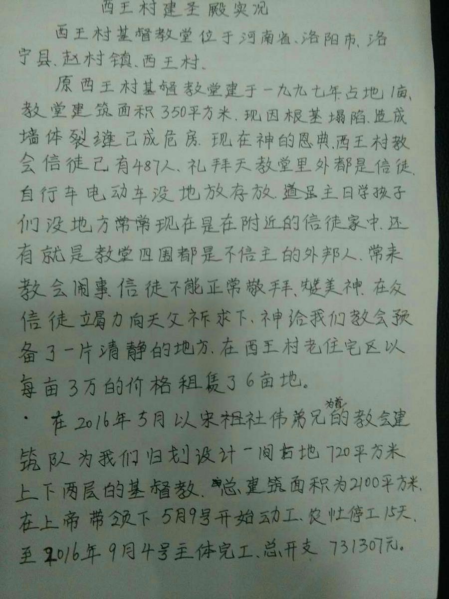 原西王村基督教堂建于1997年,占地1亩,教堂建筑面积为350平方米。现因根基塌陷,造成墙体开裂,已成危房;西王村教会信徒目前有487人,主日礼拜的时候教堂内外都是信徒;自行车、电动车等交通工具无处存放;主日学的孩子们也没有专门的学习场所,目前在教堂附近的一位信徒家里聚会;此外,教堂周围都是未信的村民,常来教会闹事,打扰信徒的正常聚会活动。教会因此决定建立新的教堂。