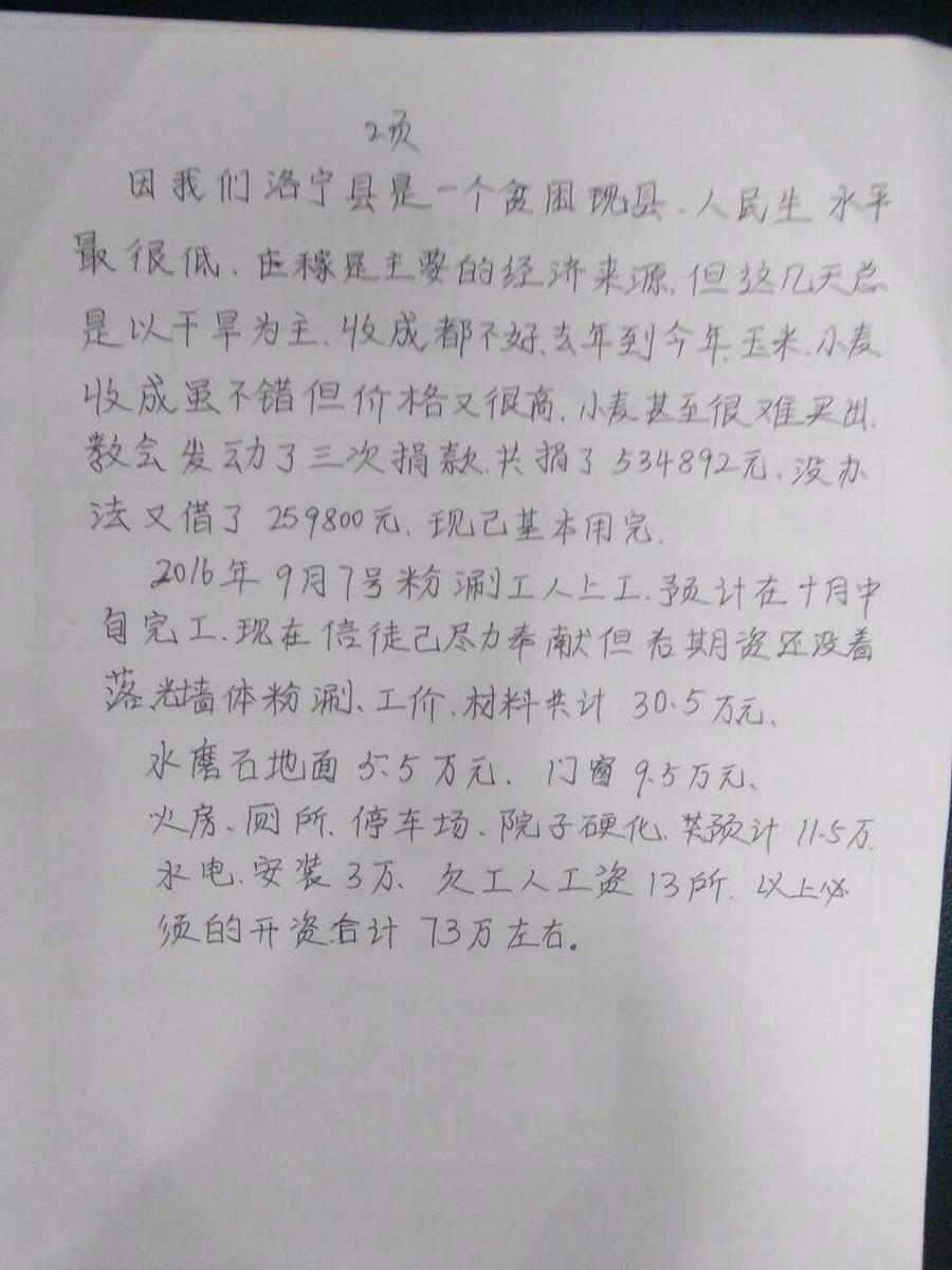 因洛宁县是贫困县,人民生活水平很低,庄稼是最主要的经济来源,但近几年的气候以干旱为主,收成都不好。去年和今年农作物收成虽不错,但在不良因素影响下难以卖出。教会为建设教堂发起过三次捐款,所得共534892元人民币,又借入259800元人民币,现已基本用完。