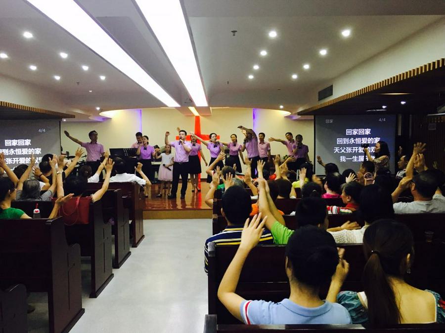 见证结束,敬拜赞美队又带领会众唱诗《亲眼看见你》和《回家》,“回家回家,回到永恒爱的家,天父张开爱的双臂……”在《耶稣爱你》的赞美声中,不少还不认识神的人表示愿意接受耶稣基督为救主。