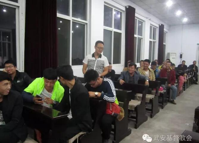 10月7日晚7:00-8:30,河北邯郸武安市基督教会举办了首次青年团契聚会,聚会中有赞美、证道、游戏、自我介绍等内容。