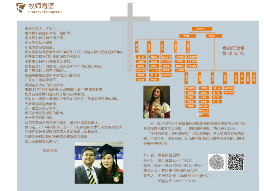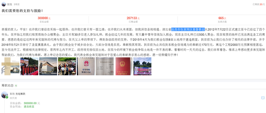 “轻松筹”中介绍说:“亲爱的家人:平安!也许我们曾经在禾场一起服侍,也许我们曾只有一面之缘,也许我们从未谋面,但我深信圣徒相通。湖北省宜昌市伍家岗区基督教会从2012年7月22日正式建立至今已经过了四个年头,在开始之初我们租赁商场办公楼聚会,主日只有30多位老人参加礼拜,教会经过几年的发展,有大量中青年信徒加入教会,现在主日礼拜已近500人聚会,现在租赁的场所已无法满足圣工的需要。感恩的是经过近两年弟兄姐妹的代祷与努力,在天父上帝的带领下,得到各级政府的支持,于2015年4月为我们教会划拨8亩土地用于建造教堂,到目前为止我们也办好了相关的法律手续,并于2016年5月21日举行了圣堂奠基典礼。由于我们教会处于城乡结合处,大部分信徒是农民,奉献极其有限,到目前为止共收到本教会信徒竭力的奉献近170万元,离这个工程2000万元预算相差甚远,至今无法开工。根据相关法律规定,若两年之内不开工,政府将无偿收回土地。在现今的环境下教会能争取土地是一件不易的事,看着时间一天天的过去,我们非常着急,惟求上帝感动更多弟兄姐妹帮助我们,为我们代祷与奉献,愿上帝记念您的爱心,我代表全教会弟兄姐妹对于您爱心的奉献表示衷心的感谢。愿一切荣耀归于神!”