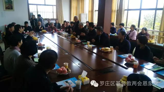 据罗庄区基督教两会消息,张永胜牧师首先向来访客人介绍了罗庄教会的一些基本情况,包括教堂购买、改建的过程;教会举办的培训;财务双代管模式;制度建设;爱心小屋;1919实物银行等,后带领客人参观了恩泉堂大堂、财务室,档案室,图书室等。