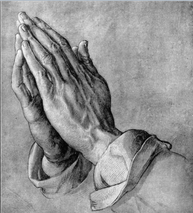 《祈祷的手》是画家丢勒最为著名的画作,相传画家出身贫寒,家中兄弟手足众多,而丢勒和他的哥哥却都对艺术深有兴趣,无奈两人只能以掷铜板的方式选择一人去艺术学院读书,而留下的一人去矿场工作供给学费。等一方学成之后,再供养另一人学习。丢勒胜出,便奋发图强,以优异的成绩毕业,他履行诺言准备回乡供给哥哥能去艺术学院学习,但是哥哥却因在矿场上的辛苦工作,手指关节已经变形,不能再拿起画笔刻刀。只能放弃原来的梦想,但是却为弟弟的学成归来大感欣慰和高兴。丢勒不经意间撞见哥哥为他在上帝的面前合手祷告,祈求上帝赏赐加倍的才华给予弟弟。让丢勒感动不已,他便绘下这双祷告的手,其中充满了敬虔和爱,因而闻名天下。