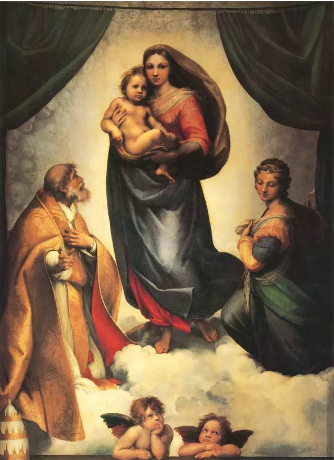 《西斯廷圣母》是诸多圣母画作中的代表作,讲员介绍,圣母和小耶稣的眼神皆怀忧虑,传达了对于人类的堕落忧心忡忡。很好地表达了画作中救赎的立意。画面下方分别是教宗和圣女芭芭拉,教宗的一只手放在胸前显出崇敬之心,另一只手指向人间。而另一侧圣女芭芭拉则面带喜悦,满怀憧憬盼望。画面底部可爱的小天使则也表达了对于圣婴诞降的关注。