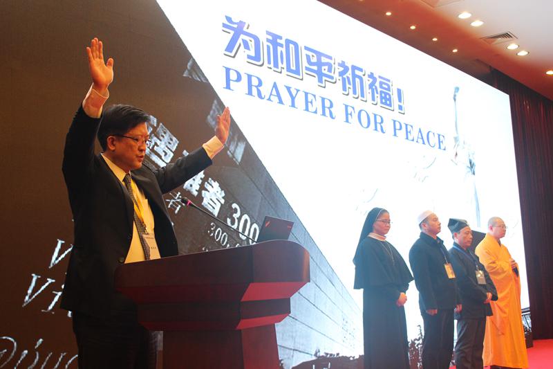 “祈祷世界和平”“祈祷世界和平,祈愿世界大同”“反对战争,祈祷和平”“为死难者祈祷,也为世界和平祈祷”“愿主耶稣基督的恩惠,天父上帝的慈爱与圣灵的感动与全中国的百姓同在,永远和平,永远幸福,阿们!”五大宗教代表的祈祷声此起彼伏。