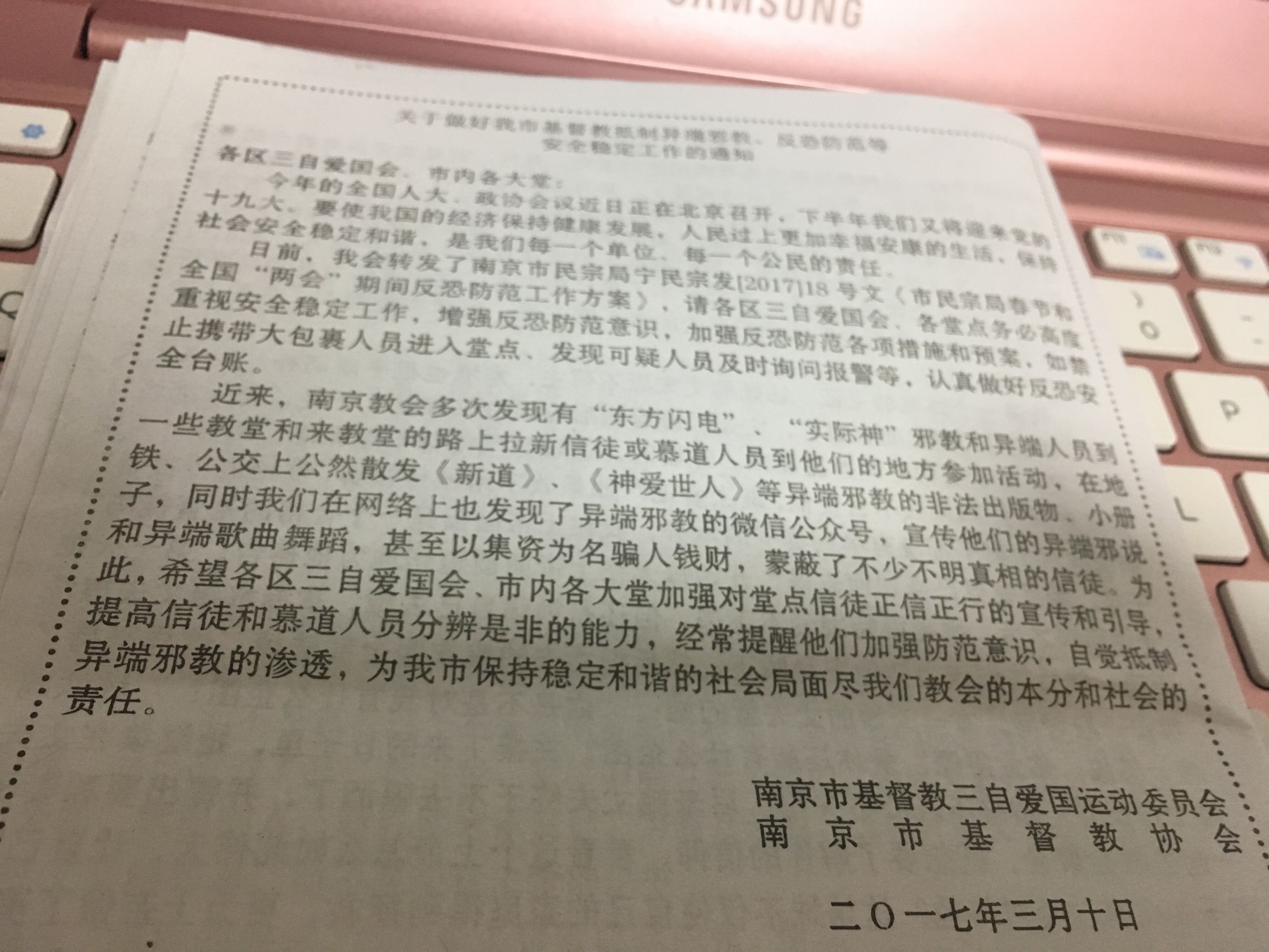 日前,南京市基督教两会转发了南京市民宗局宁民宗发【2017】18号文《市民宗局春节和全国“两会”期间反恐防范工作方案》,请各区三自爱国会、各堂点高度重视安全稳定工作,增强反恐防范意识,加强反恐防范各项措施和预案。并提醒信徒们注意提防异端邪教的侵扰。