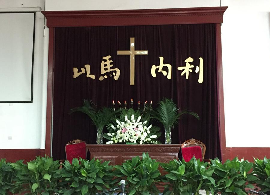棕枝主日这天,缸瓦市堂主堂十字架下的桌子上摆放着亮着的“金灯台”,“金灯台”前是棕树枝衬底的百合摆花,花的两旁放着两瓶棕树枝。在讲台旁边的墙上,挂着耶稣荣入圣城的画。