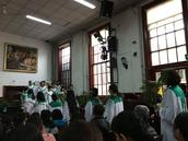 接着,诗班献唱了两首与棕枝主日相关的诗歌《棕树颂》《众城门哪!抬起头来》:“青翠的棕树叶满路铺垫,鲜艳的野花沿着大道开遍,群众前呼后拥迎接基督……”;“众城门哪,抬起头来,摆动你永久的门户,因那荣耀的王将进来……”。