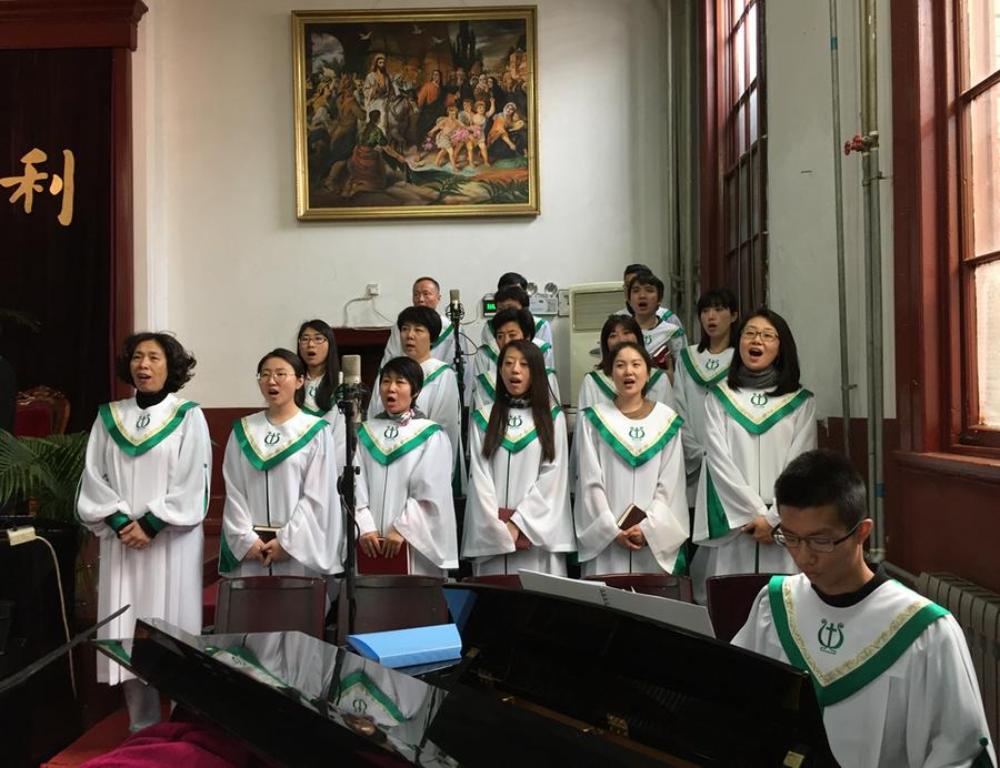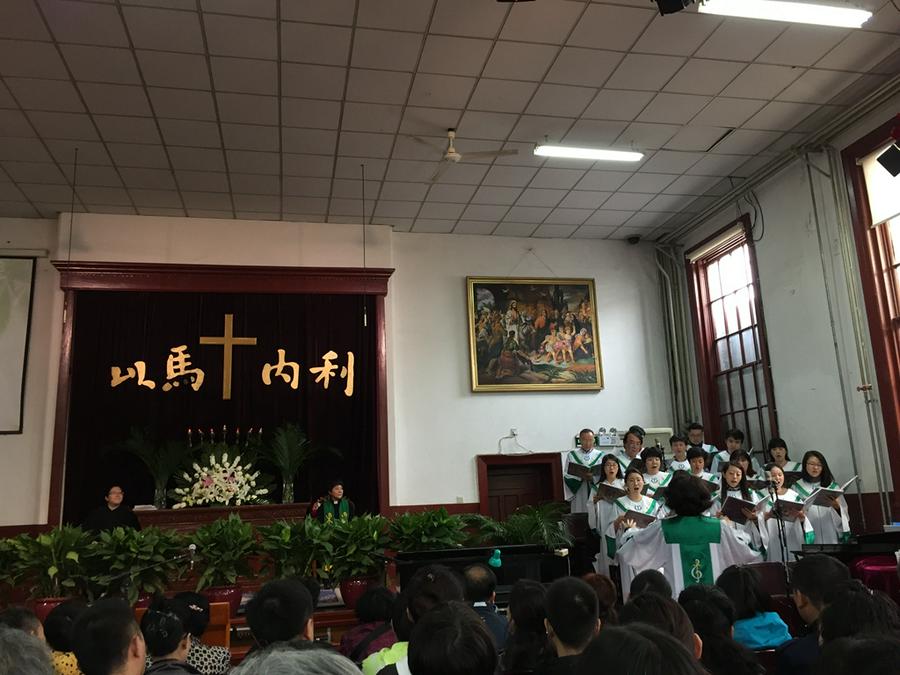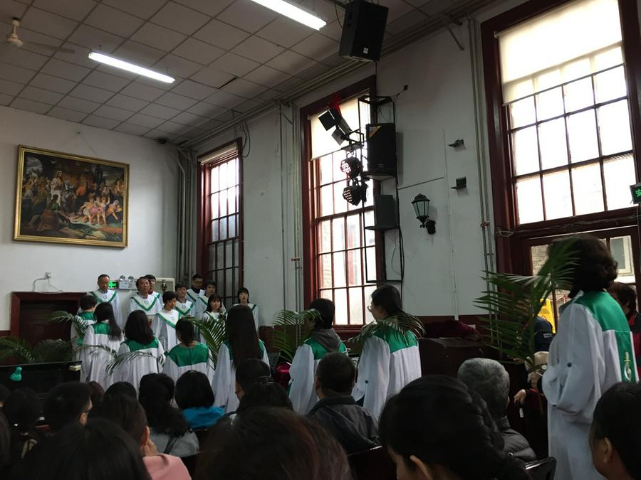 4月9日上午10:30,伴随着钢琴演奏的《三圣文》歌,诗班成员手拿棕树枝步入教堂,拉开北京缸瓦市堂第三堂棕枝主日崇拜的帷幕。