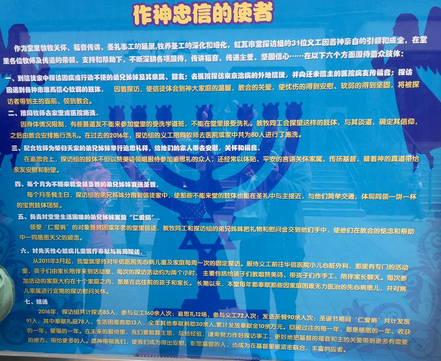 北京基督教会缸瓦市堂院内的宣传栏中介绍了该堂开展的6项关怀事工,并且总结了2016年所开展的活动。