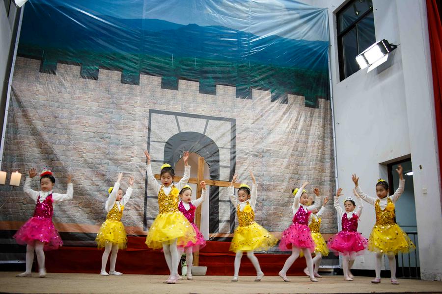 儿童主日学小朋友带来的第一个节目是舞蹈:《野地百合》。身穿洁白裙子的小朋友表演野地含苞开放的百合花,朵朵芳香的百合花也在轻轻歌唱:赞美主,赞美主。从高山到低谷,大地充满主的祝福。