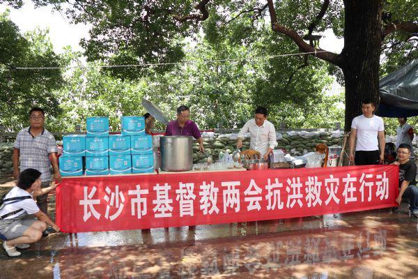 近日,长沙市暴雨连连,给人民群众生命财产造成重大损失,为了表示对坚守在抗灾一线志愿者的感谢,大力弘扬圣经教导的博爱精神,秉承一方有难八方支援的传统美德。2017年7月3日上午,长沙市基督教两会主席、会长带领长沙市基督教两会的同工,精心准备了绿豆粥、矿泉水等慰问品,慰问了抗灾一线的志愿者。