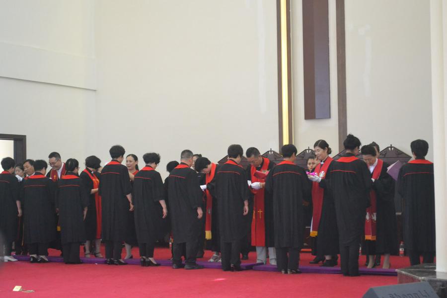 由于人数多,本次按立采取分组进行,每组10人左右。按立后,按立团牧者给新牧者授圣衣、赠圣经、送鲜花。全部按立结束后,张月竹牧师代祷,求神赐他们智慧和能力,然后宣告:“你们可以按照教会的规定,在教会内施行圣礼,讲解圣经,传扬福音,治理教会!”