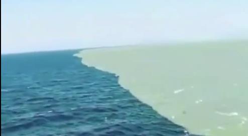 视频中显示船在蔚蓝的大西洋海面上航行,快接近地中海的海面时,眼前出现了一片绿色的汪洋,那就是地中海。在大西洋与地中海洋面接触处,一条由蓝绿相间的线,把大西洋与地中海完全地区分开来。