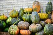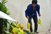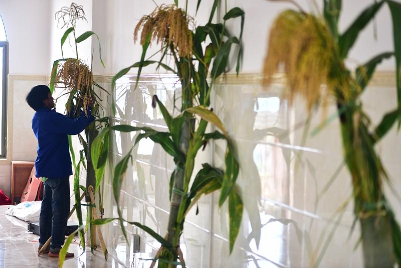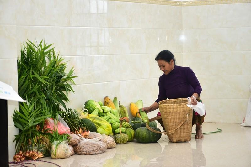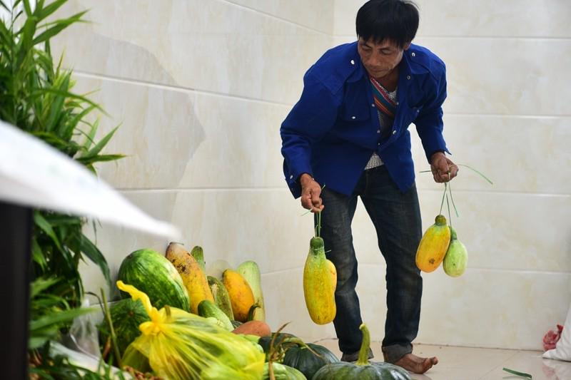 去台前看的时候,有各种类型的南瓜、饱满大粒的花生、入秋后第一次收的大米、叶子还绿着的葱和姜,鲜嫩的黄瓜,以及其他蔬菜。