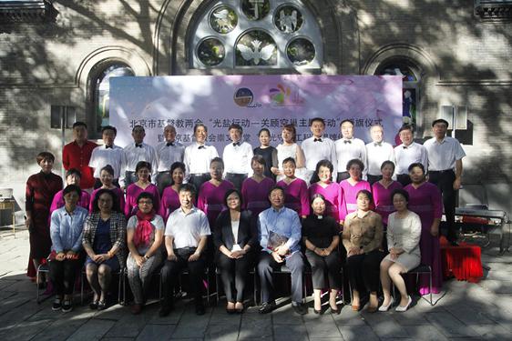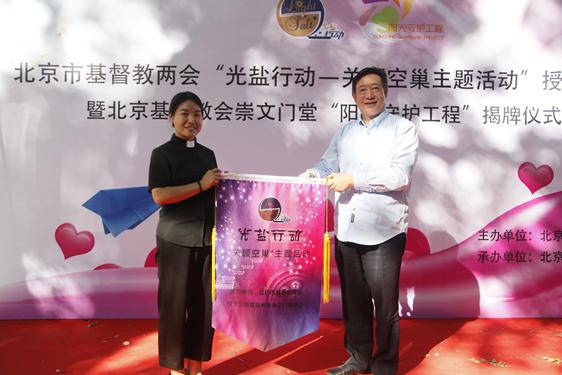9月22日,北京市基督教两会“光盐行动—关顾空巢”主题活动授旗仪式在崇文门堂举办,蔡葵主席代表市基督教两会将写有“光盐行动—关顾空巢主题活动”的旗帜授予崇文门堂。