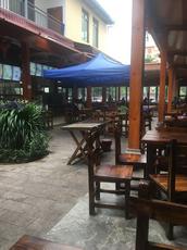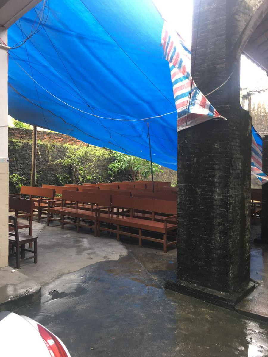 目前本堂信徒礼拜都聚集在教堂对面搭建的一个临时教堂里,天气好的时候在教堂旁庭院的露天聚会场所也颇有海南特色风格,海南有很多的茶店多是三四面大敞的,我个人理解所谓的堂食就是来自海南的这种建筑风格吧。