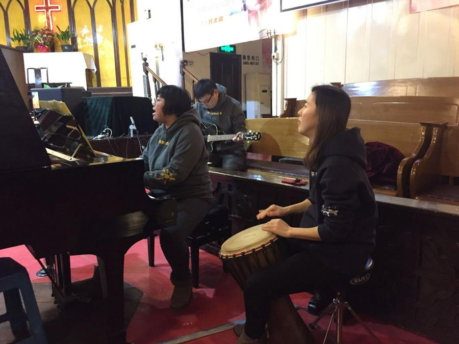 然后在钢琴,鼓声,歌唱中教会带领弟兄姐妹们一起进行赞美,《神就在这里》、《让我们来庆贺》、《你是荣耀的君王》等都表达了对主的感谢之情。