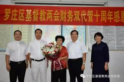 随后,张永胜牧师邀请郑功敏高级会计师到前台,接受张建顺牧师代表罗庄区基督教两会赠予的鲜花,郑会计也与同工们共勉,当牢记起初的蒙召。