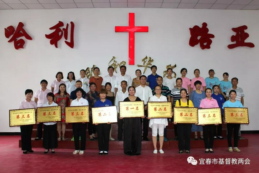 通过吴旋牧师、聂国强教师,兰萍老师三位评委的认真评定, 评出了一等奖一名、二等奖三名、三等奖五名。易载忠、吴旋、聂国强等人分别代表市基督教两会为获奖诗班发奖。