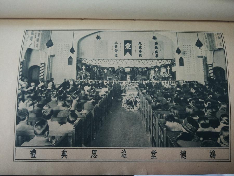 商务印书馆的经理和创办者之一的鲍咸昌主持了礼拜。鲍先生是鸿德堂的长老,他的父亲是教堂第一任牧师。现任牧师是蒋时叙牧师,之江大学(Hangchou College)和南京神学院(Nanking Theological Seminary)的毕业生。”