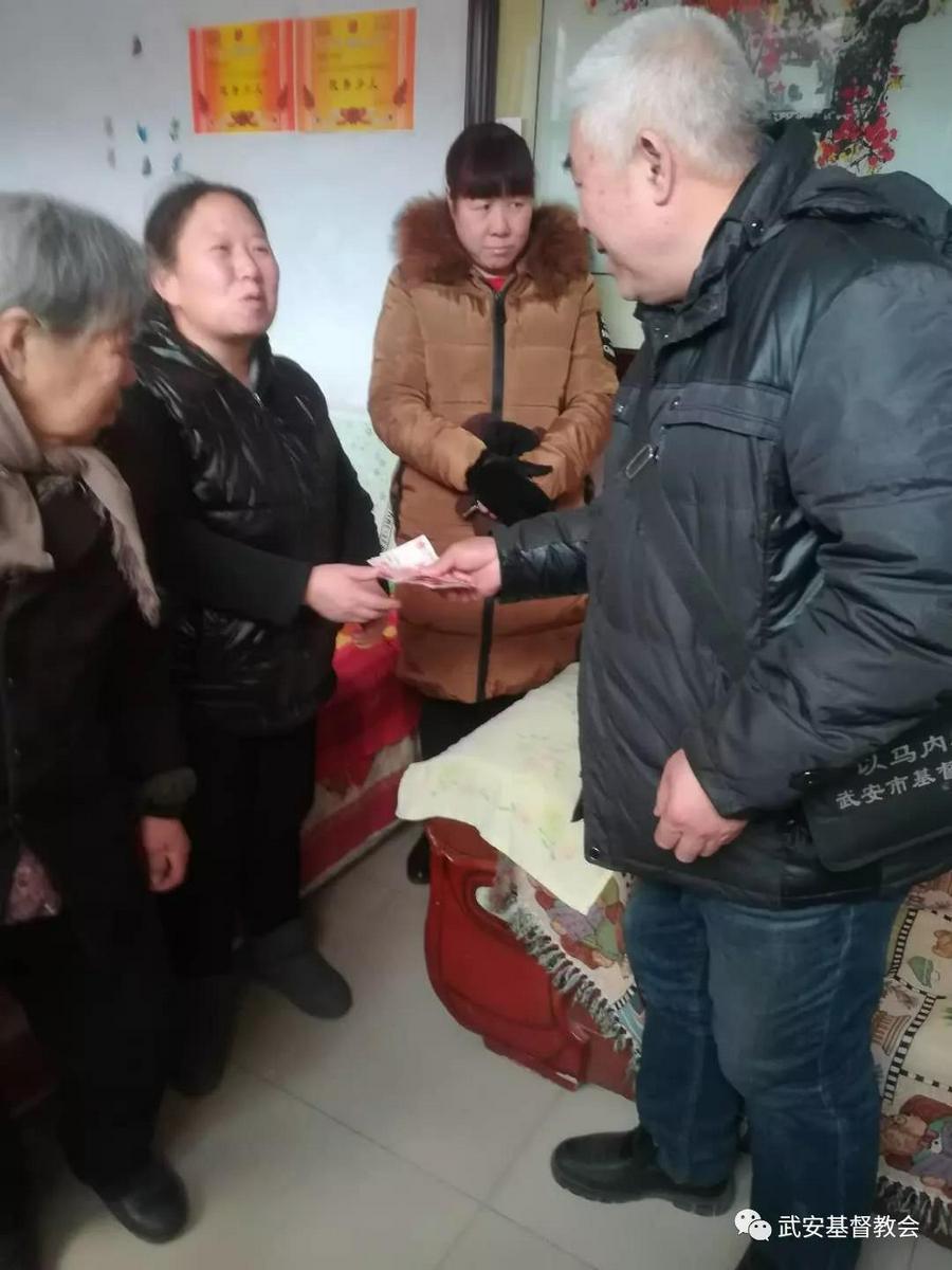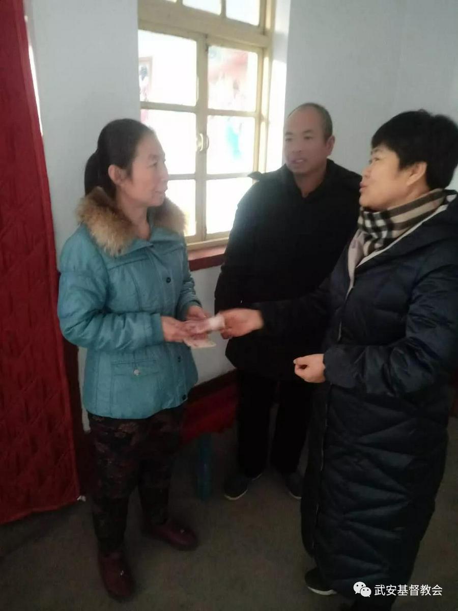 2019年1月16、17日两天,河北武安市基督教会李秀丽牧师带领赵栓太、靳虎明长老,行程数百公里,走访了9个特困户,给这些家庭送去了春节慰问金。