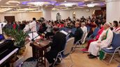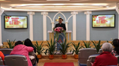 在潮韵圣歌团献唱后,王媛牧师介绍了该圣歌团并鼓励在圣乐方面有恩赐的弟兄姊妹兴起服侍。她还为会众祝福。