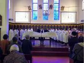 讲道后由李兰成牧师主礼圣餐礼拜。由李兰成牧师、王雪峰牧师、樊蕾牧师、马莉牧师四组同分圣餐。
