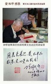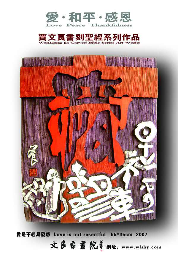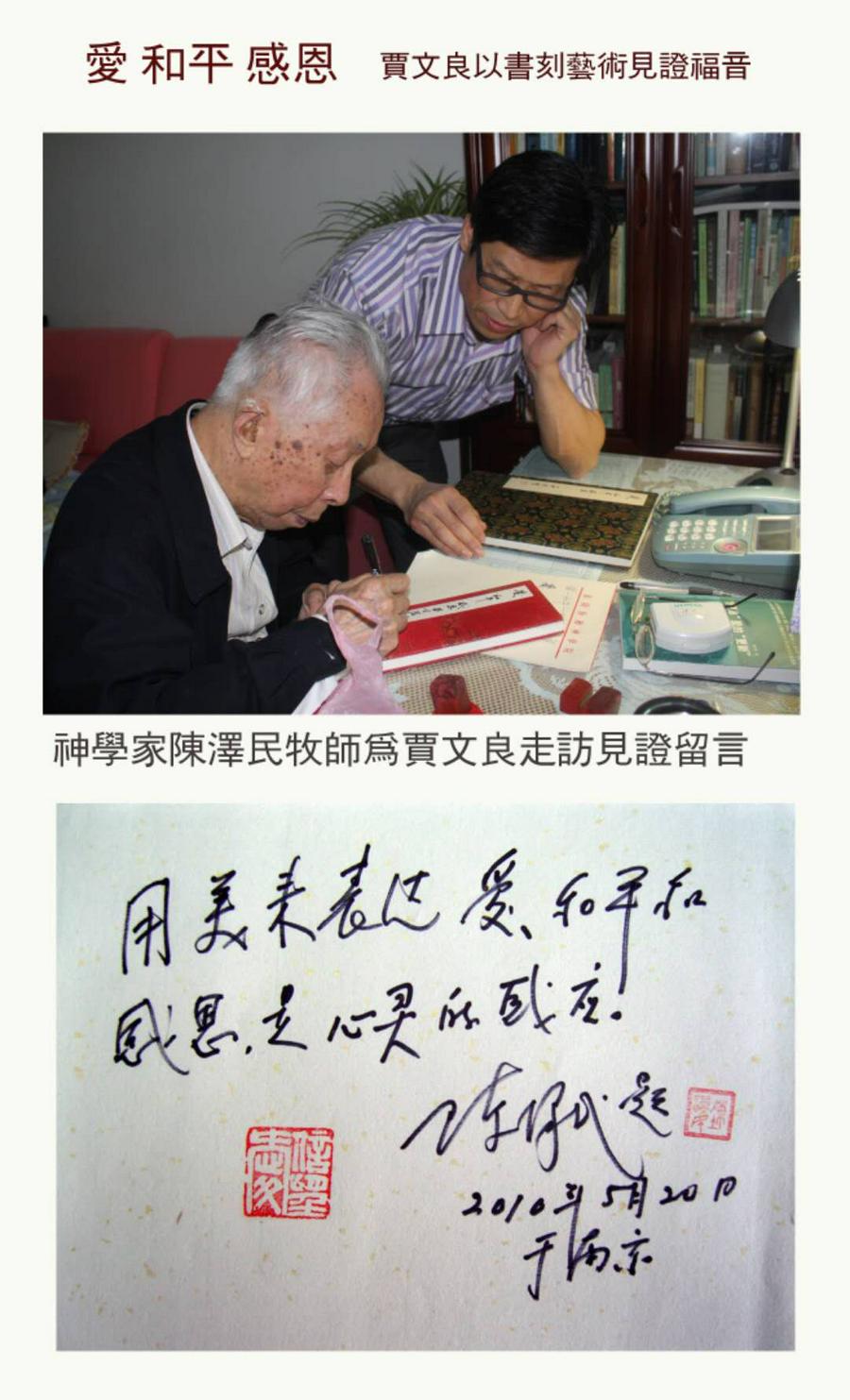 2010年我分别选择“神愛世人",“喜乐的心乃是良药"两幅书刻在南京各印刷二万张,走访时赠送给各地教会。5月20日,陈泽民牧师为我走访见证题字留言:“用美来表达爱、和平和感恩,是心灵的感应"。陈牧师坚定了我以艺术形式广传基督福音之路,愿以“愛·和平·感恩"主题书刻艺术荣神益人。