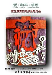 2008年,我的作品在北京展览时,让德国和平理事会会长沃特冈先生看到,通过翻译明白了我的创作内容后,他激动的和我拥抱,并称我就是和平大使,还邀请我到德国展览。当时我积累的作品不多,没有应允。但正是他的提示,才有了"愛·和平·感恩”的主题书刻。